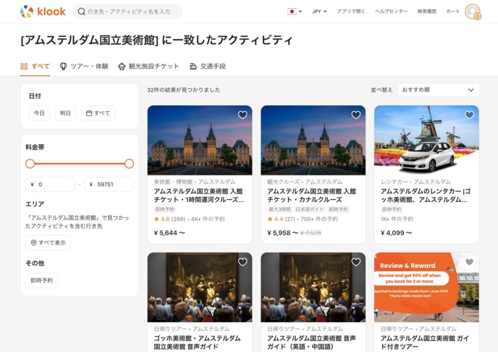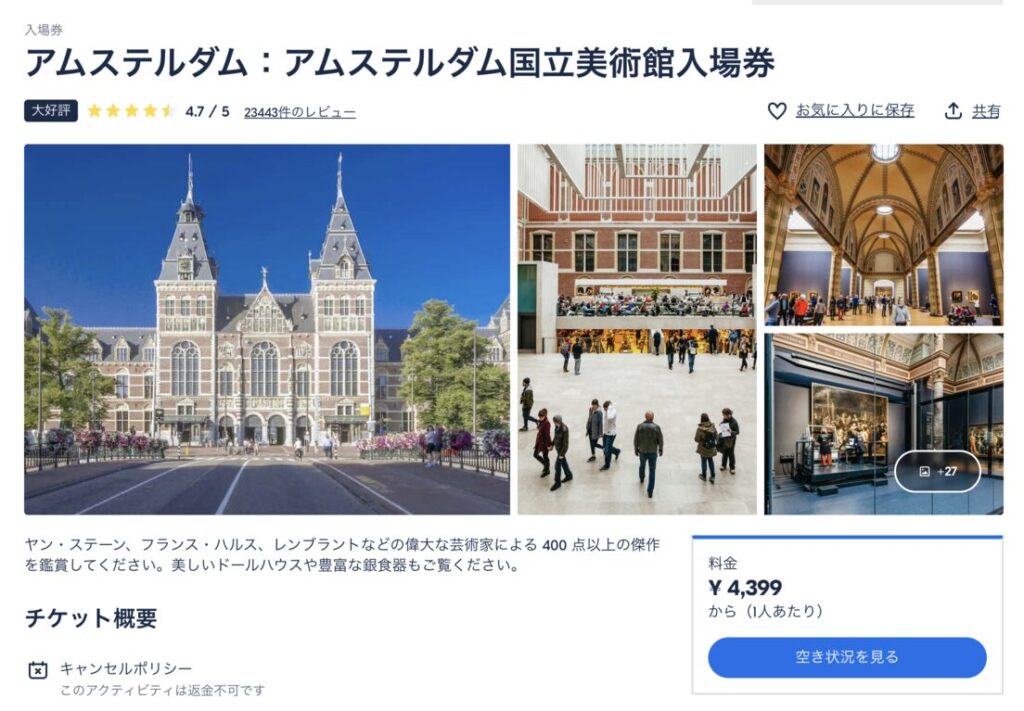 日本人にも人気のあるKlookでは、アムステルダム国立美術館の入場チケットのみは販売されていませんでした。