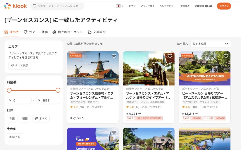 ザーンセスカンス風車村の観光ツアーに申し込みたい方は「Klook」の利用をおすすめします。
